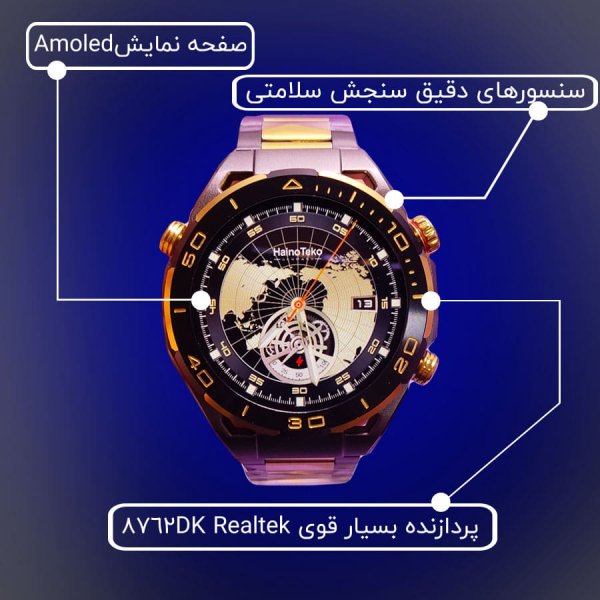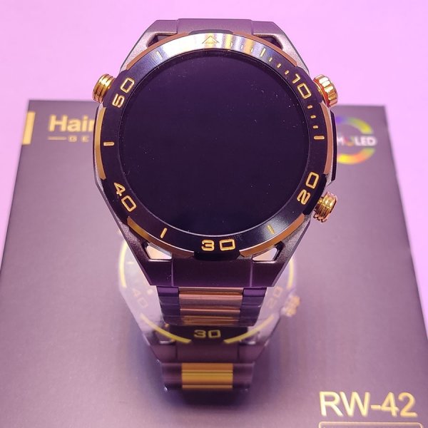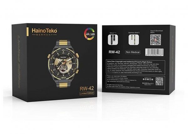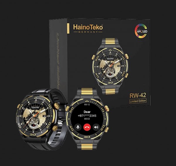 ساعت هوشمند HAINOTEKO RW-42 یک ساعت بسیار با کیفیت که ساخت برندی آلمانی و با اصالت می باشد و مخصوص کسانی می باشد که طراحی کلاسیک و اسپورت علاقه مند هستند. طراحی این ساعت منحصر بفرد گرد مشکی- طلایی با یک بند رولکسی مشکی مات است که وزن قابل توجهی دارد و بیشتر با مچ آقایان سازگار است.